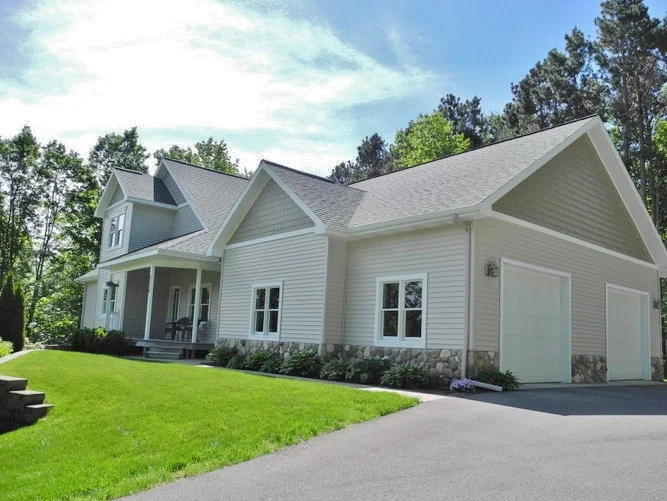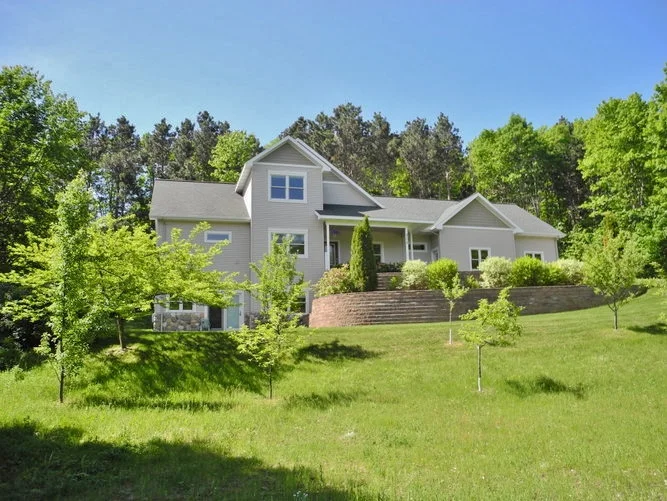 This beautiful energy efficient newer home offers over 3500 sq ft of finished living area, a great room with a gas fireplace and hardwood flooring, large kitchen with quality maple cabinetry and appliances, main level master bedroom suite and office, 4 bedrooms, a partially finished walkout lower level, a wonderful covered front porch and large rear yard deck ideal for entertaining guests and family! All in a very private partially wooded setting on a quiet paved private roadway within biking and walking distance to the charming Village of Suttons Bay!